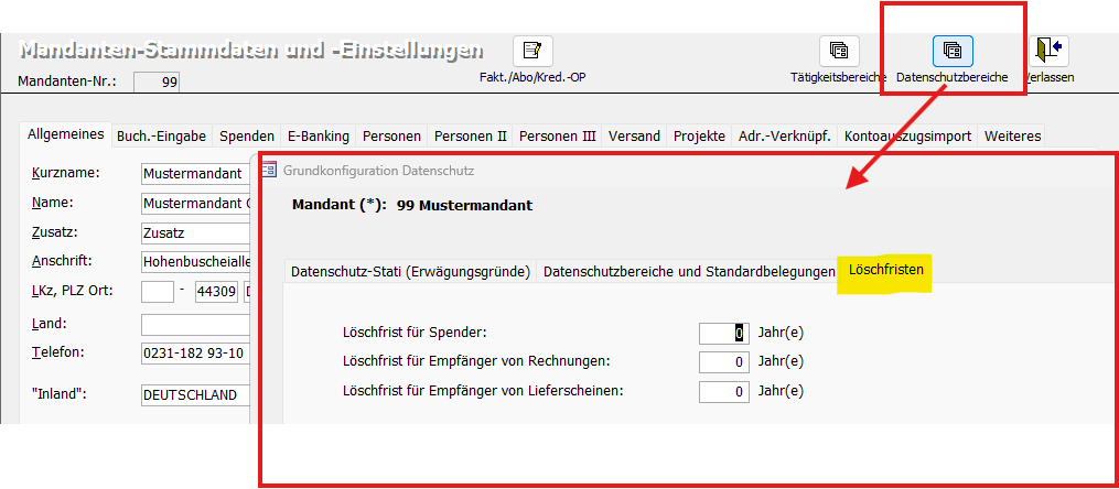 Am schnellsten über Menü Mandant / Stammdaten / Datenschutzbereiche / Löschfristen