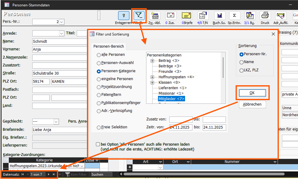 Button “Filt./S.” (das steht für Filtern und Sortieren) => damit öffnet sich das Personenbereichsfenster, hier können Sie nun entweder eine Personenauswahl, eine Kategorie oder eine Freie Selektion auswählen, und dann klicken Sie auf OK – und schon haben Sie Ihr Ziel erreicht!