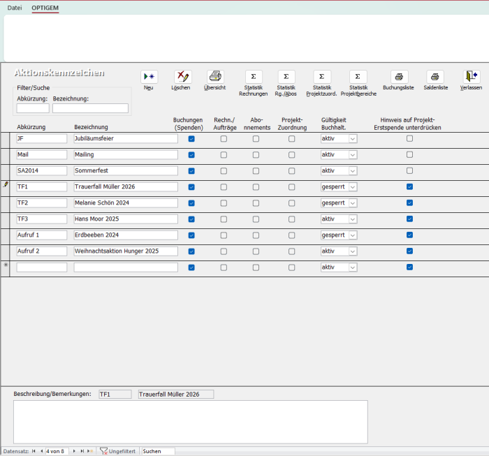 Anlass-Spenden (z. B. besondere Spendenaufrufe / Spenden aufgrund eines Jubiläums / Spenden aufgrund eines Todesfalls), für die sich die Einrichtung eines Projektes nicht lohnt, aber trotzdem Auswertungen gewünscht sind, lassen sich über ein Aktionskennzeichen buchen und auswerten.